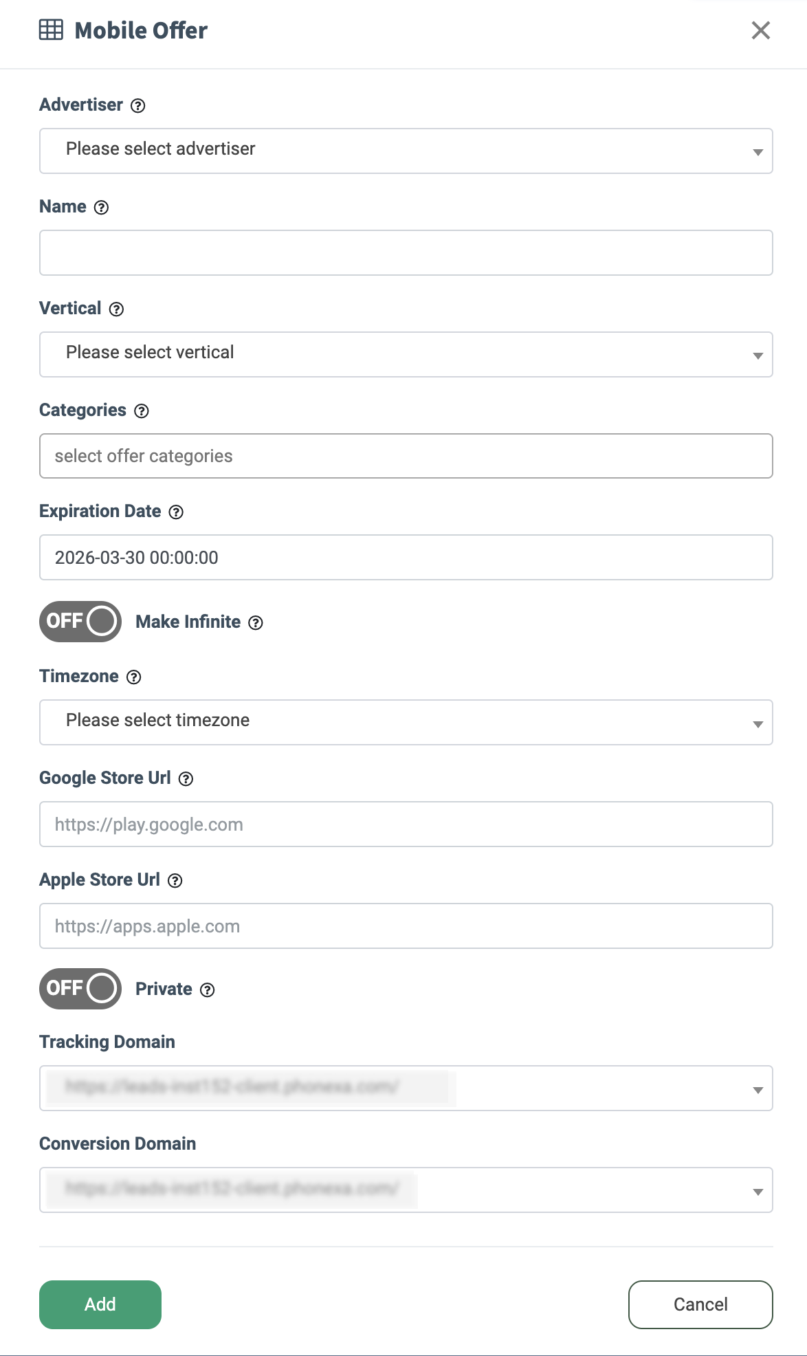 - Conversion Domain: Select a custom domain for the offer’s conversion URL. Read more about Alternative Domains in this Knowledge Base article.