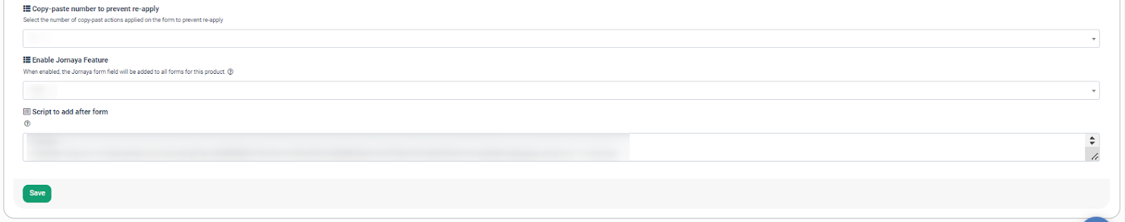 • Script to add after form: Enter your custom or third-party service JS script that will be added and executed in your JS form.