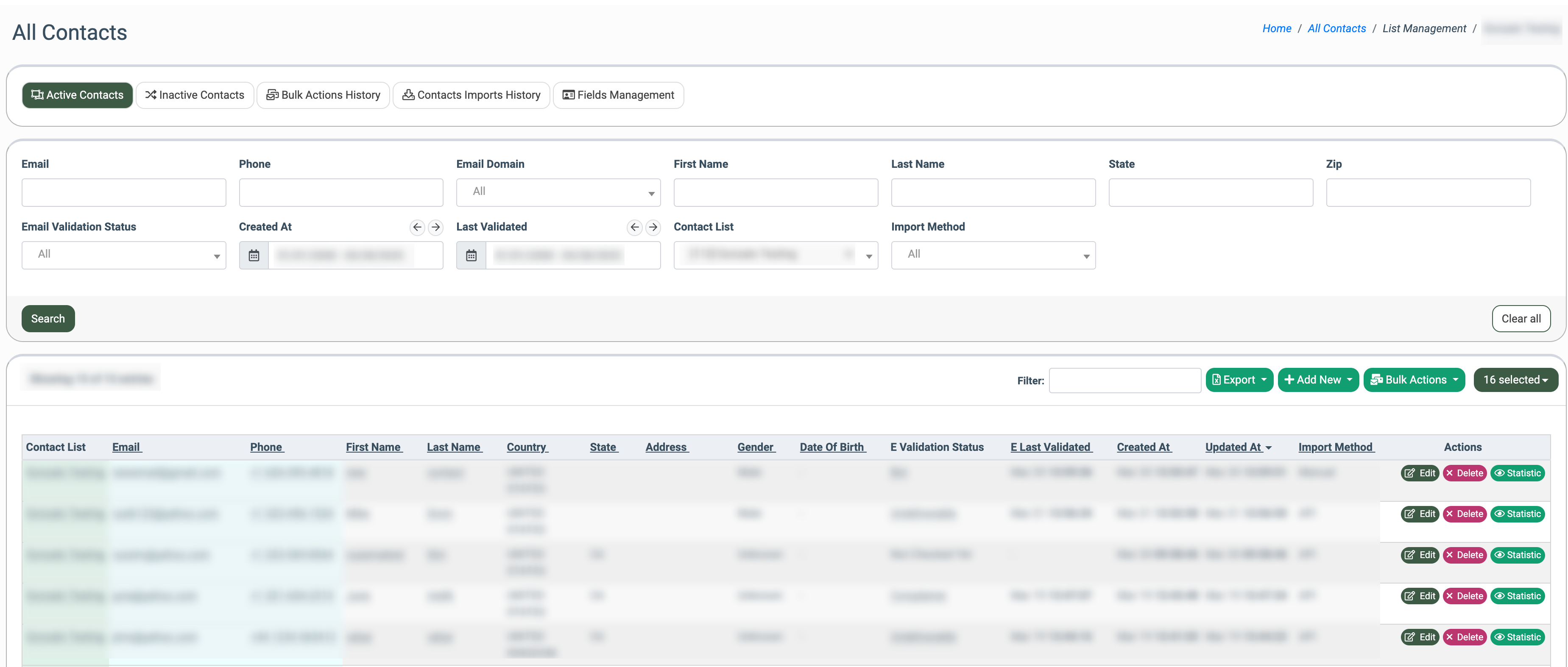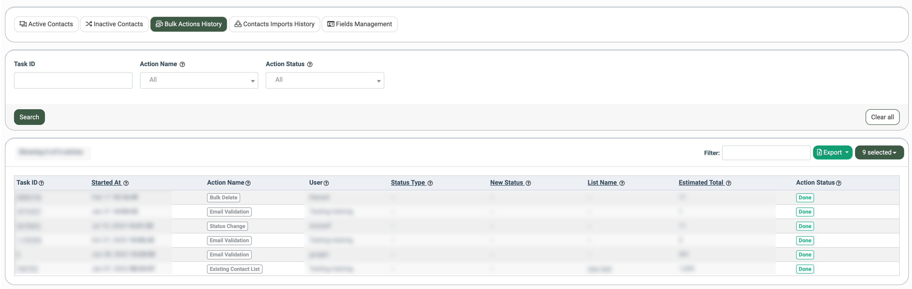 - Action Name: The name of the action (Bulk Delete, Status Change, Email Validation, Existing Contact List, New Contact List).