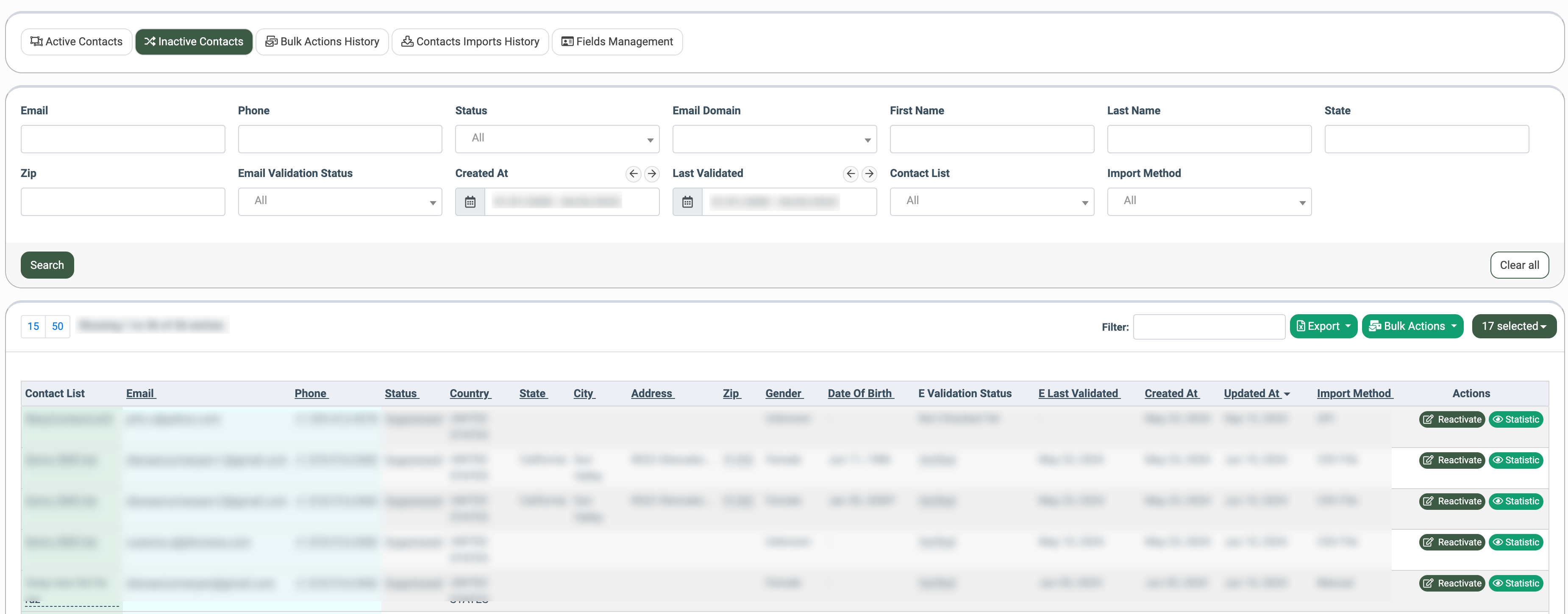 - Bulk Reactivate: Select to reactivate multiple contacts.