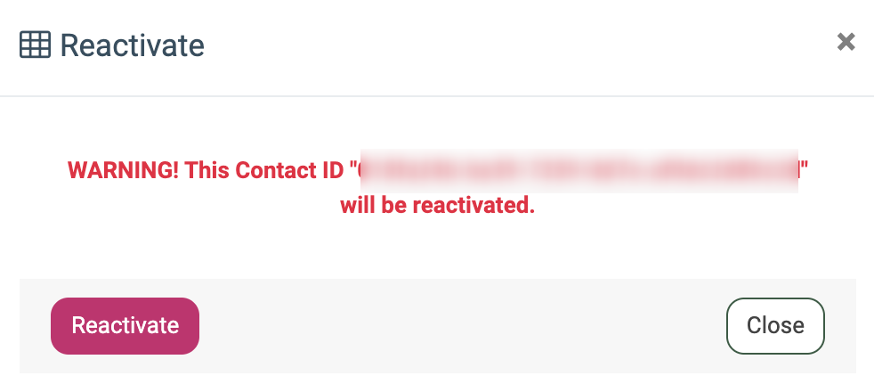 To reactivate a specific contact from the list, click the “Reactivate” button in the “Actions” column. Click the “Reactivate” button in the pop-up window to confirm the action.