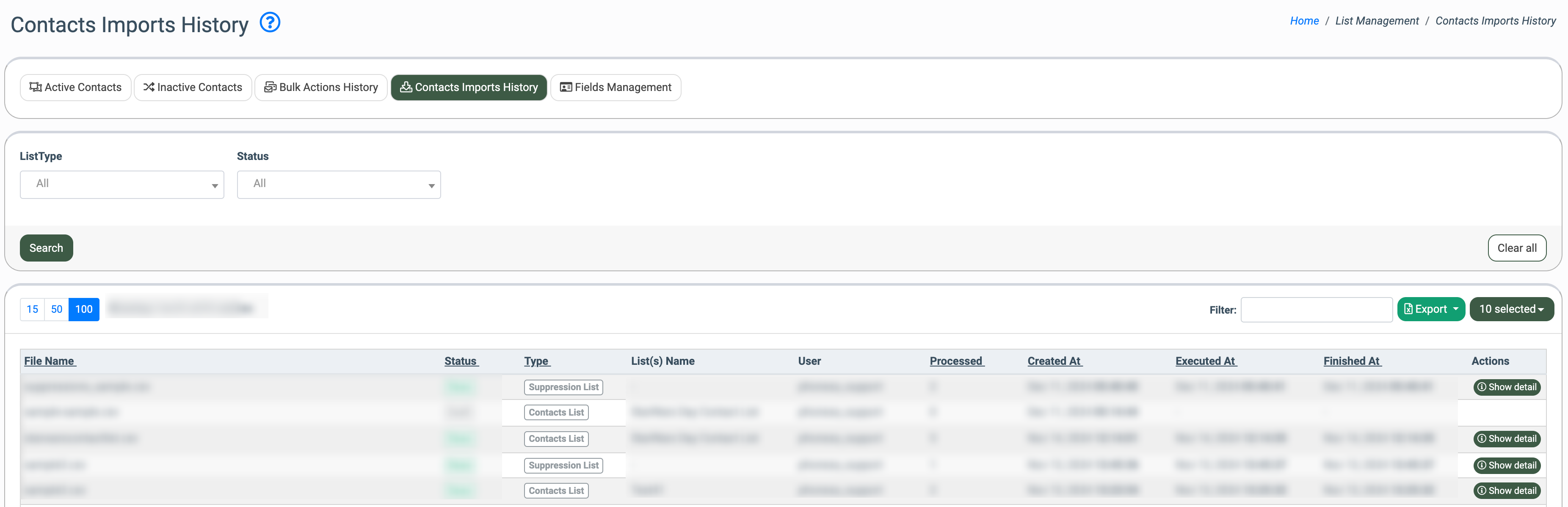 The “Contact Imports History” tab allows you to view the contact import log and the status of the recent contact imports.