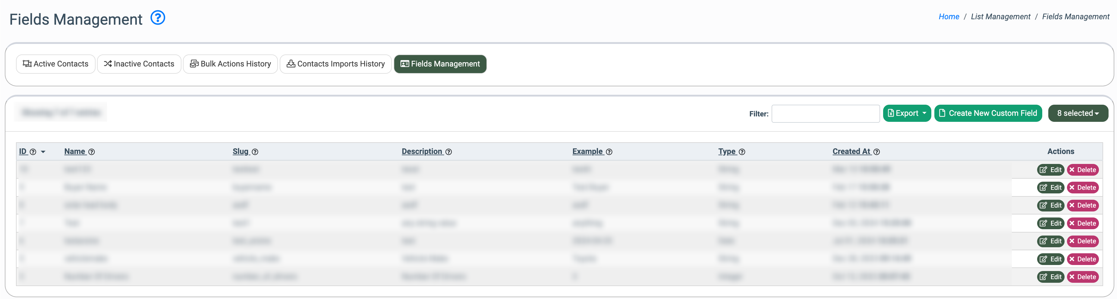 The “Fields Management” tab allows you to add and manage custom fields. These fields can be used for the contact records in the “Active Contacts” tab.