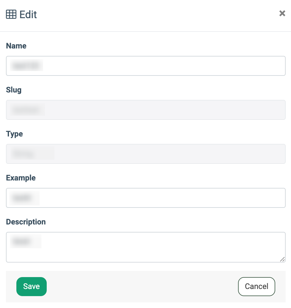 - Slug: Enter the specific field name you can use for the system placeholder and the API fields.