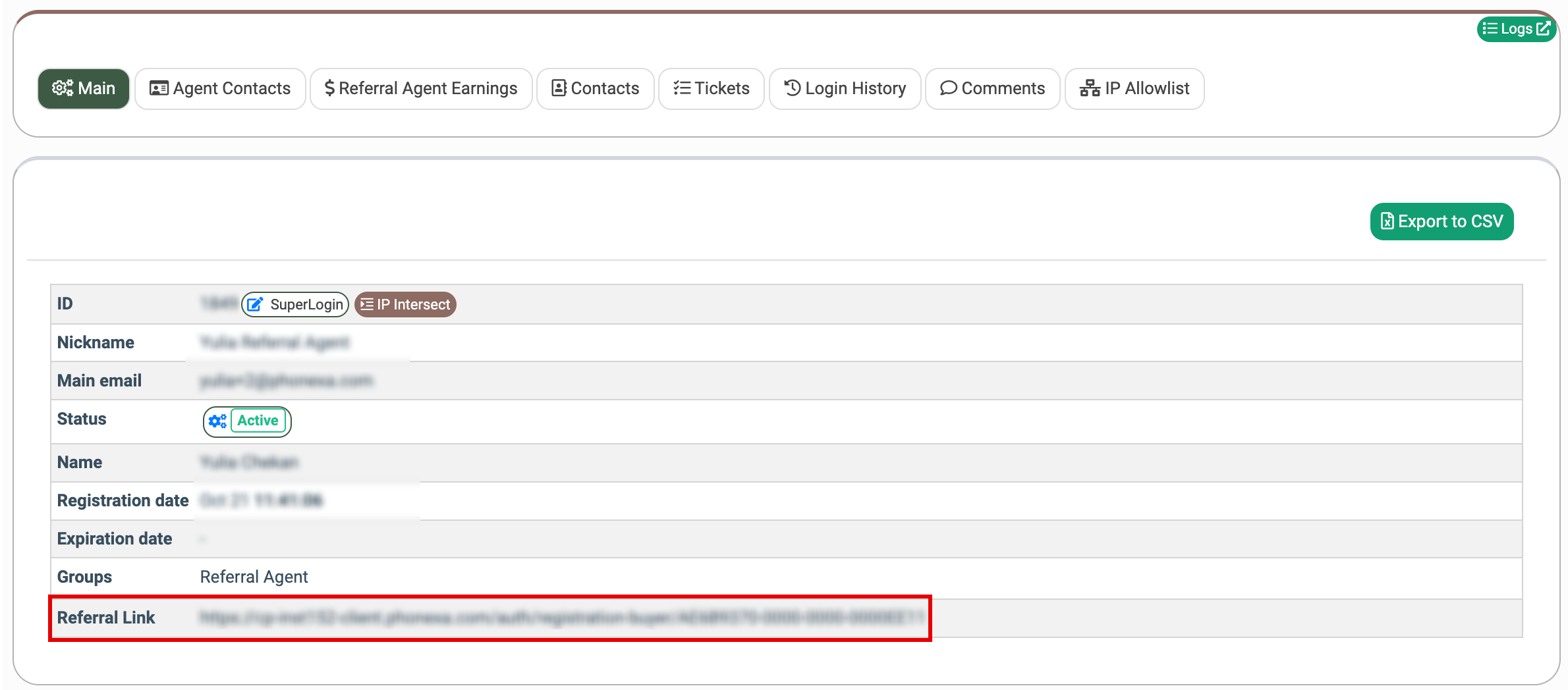 In the “Main” tab, the “Referral Link” field displays the generated link that Referral Agents can share with their Buyers for registration.