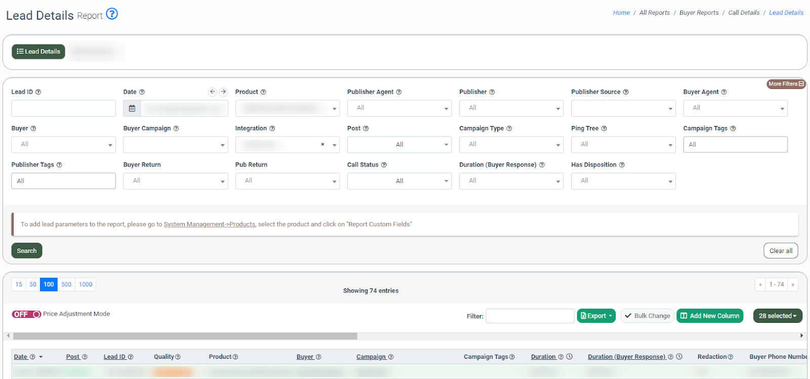 The “Call Details” tab is a report with information about the buyers’ call details, such as the date and call duration, the call transfer status, and the lead’s identification number that completes the call.