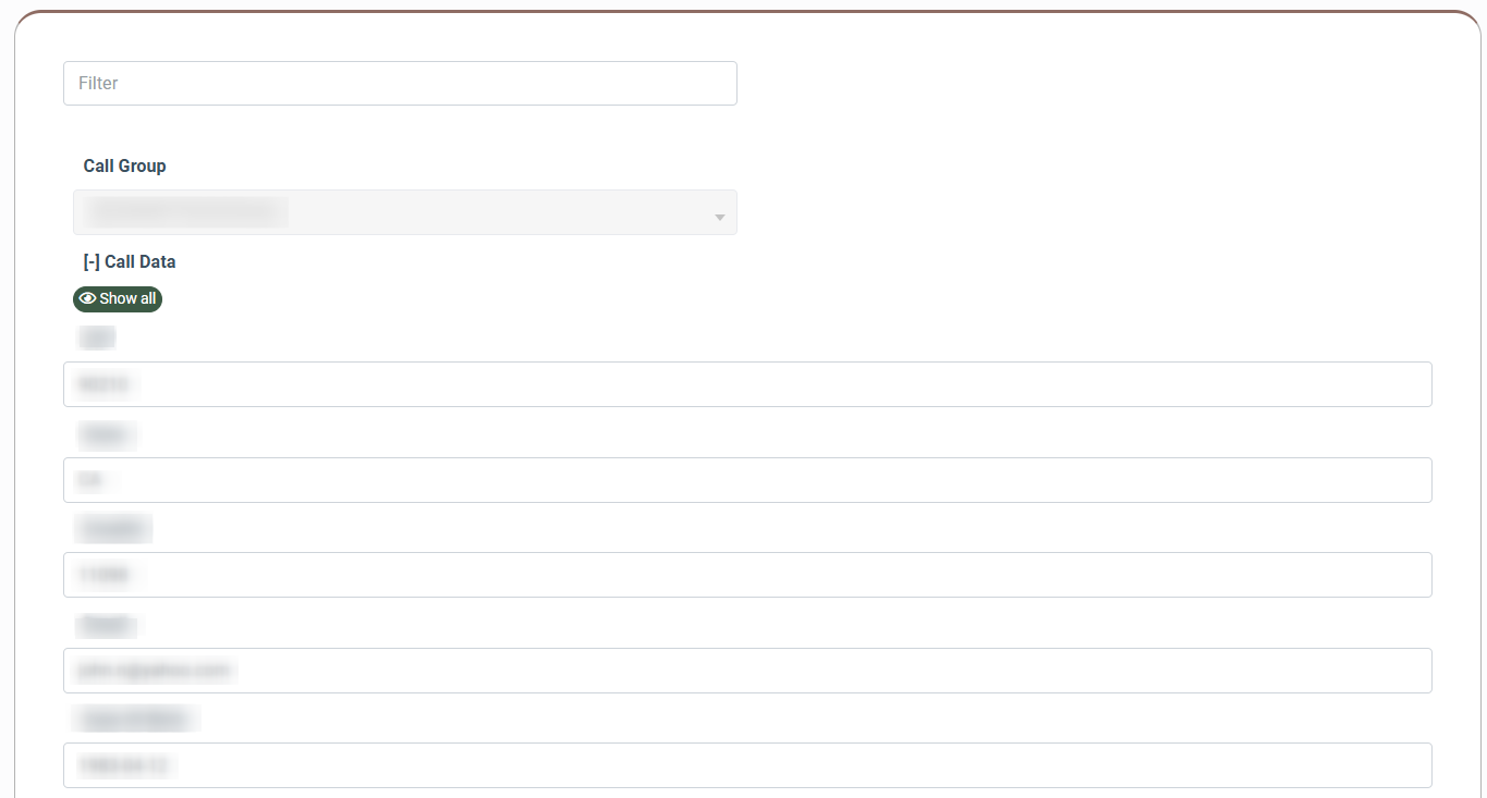 If additional information that is placed in the corresponding custom fields is available, it will be displayed in the “Call Data” section. To view this data, click the “Call Data” link.
