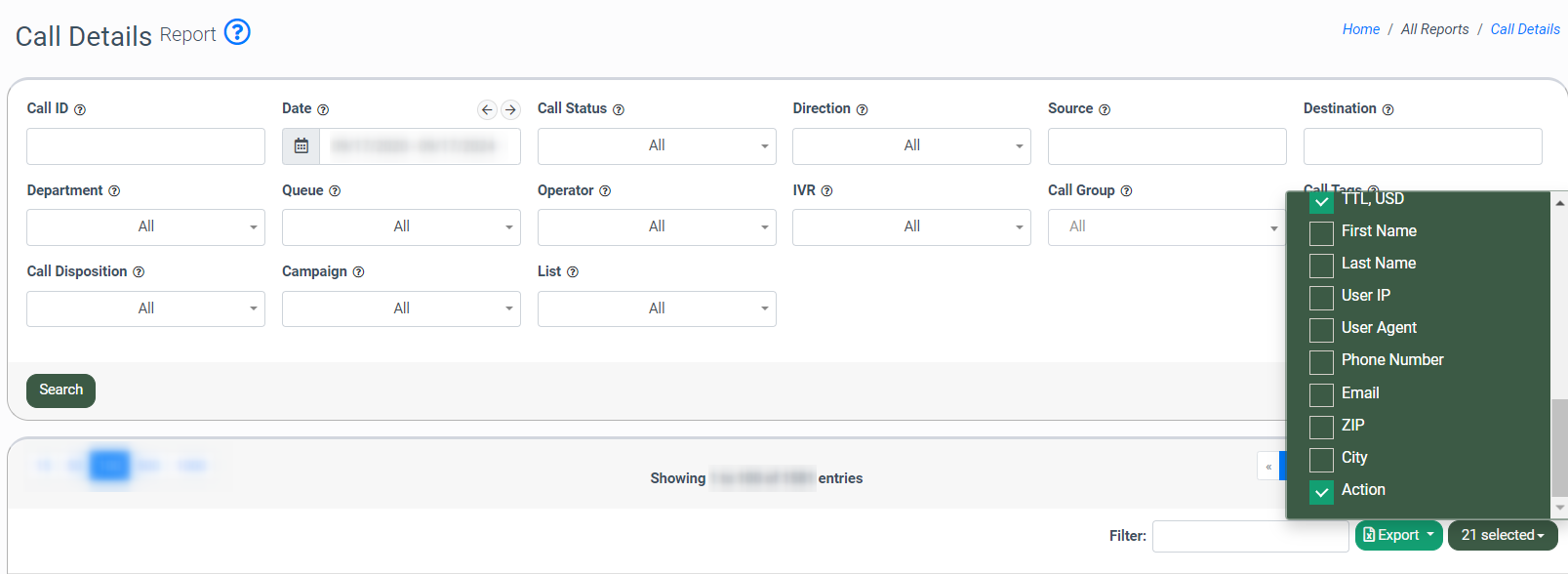 The “Call Details” report allows you to view detailed information about the calls processed through the system, including total calls handled, call durations, call recordings, and other metrics, enabling you to analyze your call center performance and call traffic. You can group calls by call status, call tag, call disposition, direction, source, destination, call group, etc.