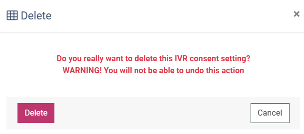 Note: If Consent is used in any IVR block, you cannot delete or change its status. When trying to delete or disable the Consent, the following message is displayed: “This Consent can not be disabled as it's currently being used in the following IVR(s)“ with the list of the IVR(s) in which it is selected (clickable).