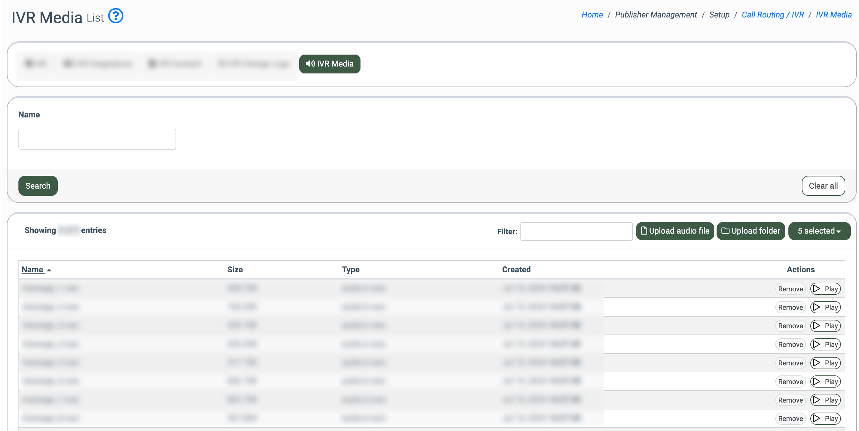 To upload files to your Media Library, go to the Publisher Management > Setup > Call Routing / IVR section and select the "IVR Media" tab.