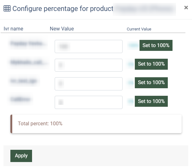 To configure the traffic distribution percentage for the IVR, click the “Configure” button next to the product name in the “Actions” column. Set the percentage and click the “Apply” button to save.