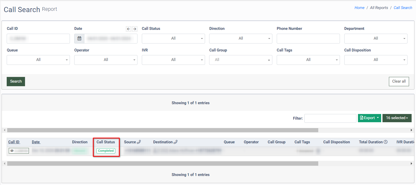 To view the Call Status for the particular processed call using the search filters, go to the All Reports > Call Search section.