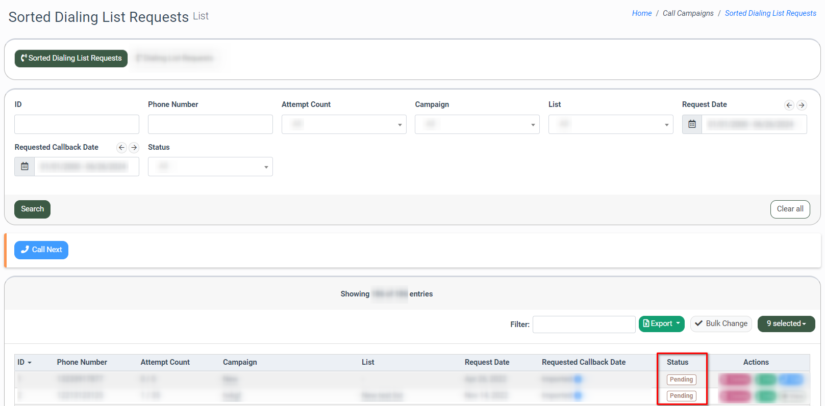 To view the call status of the sorted dialing list requests, go to the Call Campaigns > Dialing List Requests section and select the “Sorted Dialing List Requests” tab.