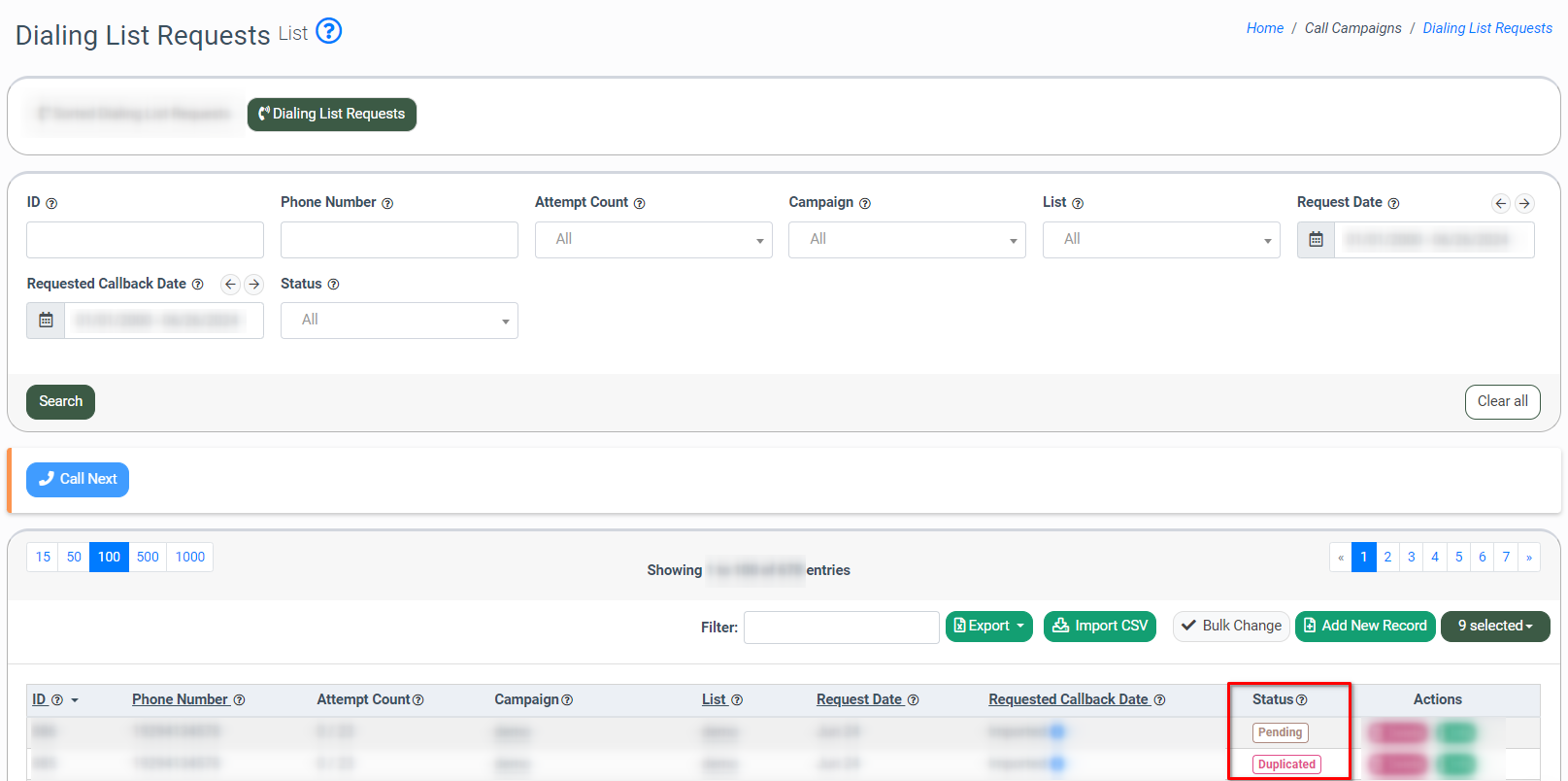 To view the current status of the dialing list request, go to the Call Campaigns > Dialing List Requests section and select the “Dialing List Requests” tab.