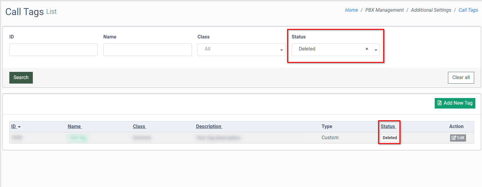 The custom call tags will be removed from the list and can be viewed only by selecting the “Deleted” option in the “Status” filter field.