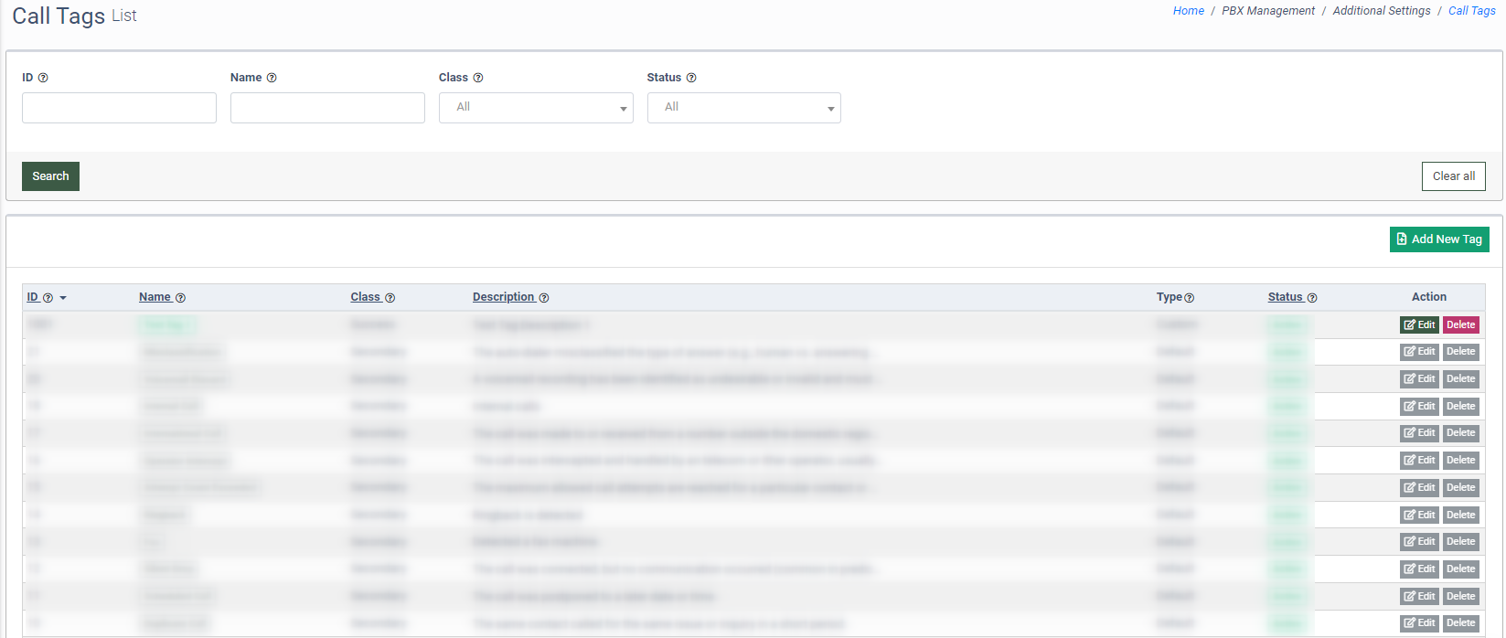 To view the list of available call tags, go to the PBX Management > Additional Settings > Call Tags section.