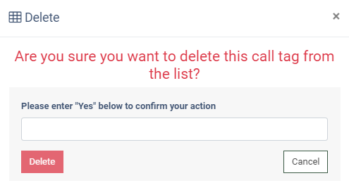 To remove the custom call tag from the list, select the corresponding record from the list and click the “Delete” button in the “Actions” column. Confirm the deletion operation by typing "Yes" in the pop-up window and then clicking the "Delete" button.