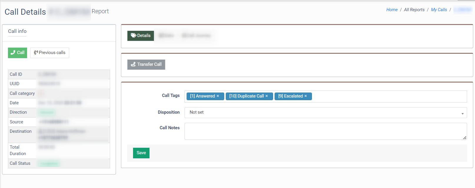 Go to the “Details” tab, assign the corresponding call tags in the “Call Tags” field, and click the “Save” button to complete the tag selection.