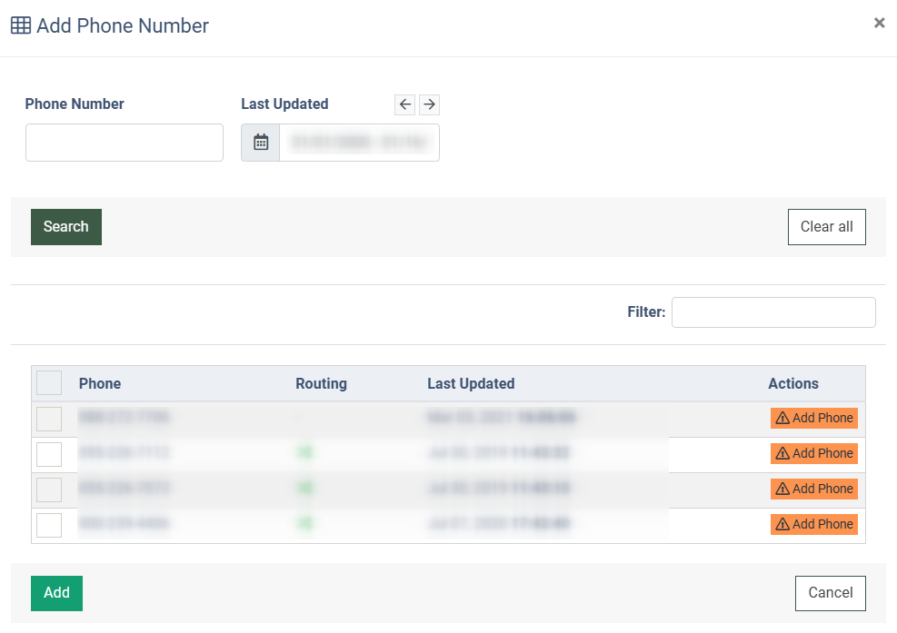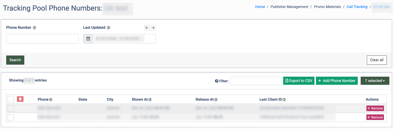 To assign a new phone number to the tracking pool, click the “Add Phone Number” button. In the pop-up window, select one of the available reserved phone numbers and click the “Add Phone” button. To narrow down the list of available numbers, use the “Phone Number” and “Last Updated” filters. Read how to assign the Phone Number to a Publisher in this Knowledge Base article.