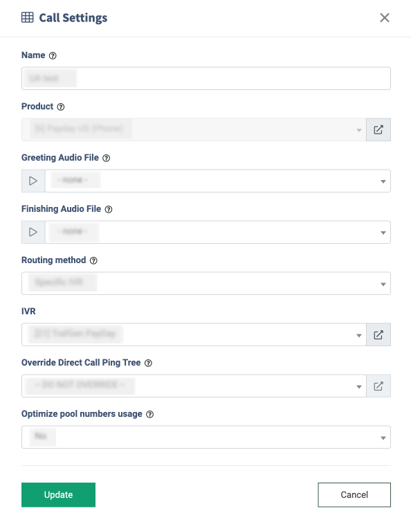 • Override Direct Call Ping Tree: Select the ping tree you want to prioritize for the direct call. To view the settings of the selected Ping Tree, click the redirect button in this field.