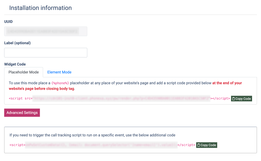 • Placeholder Mode: Insert the {%phone%} placeholder on your website and add the provided code at the end of the website page. To copy the script, click the “Copy Code” button.