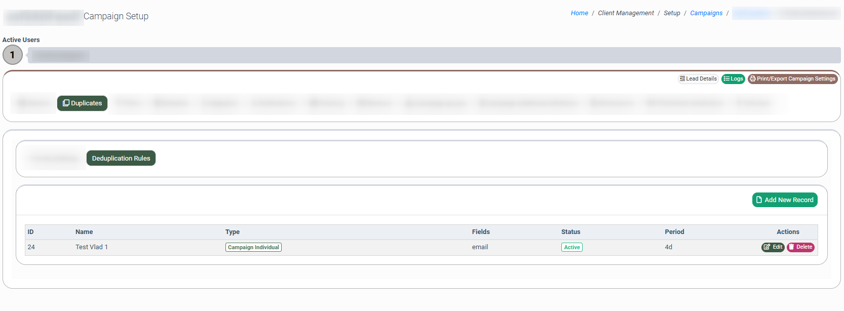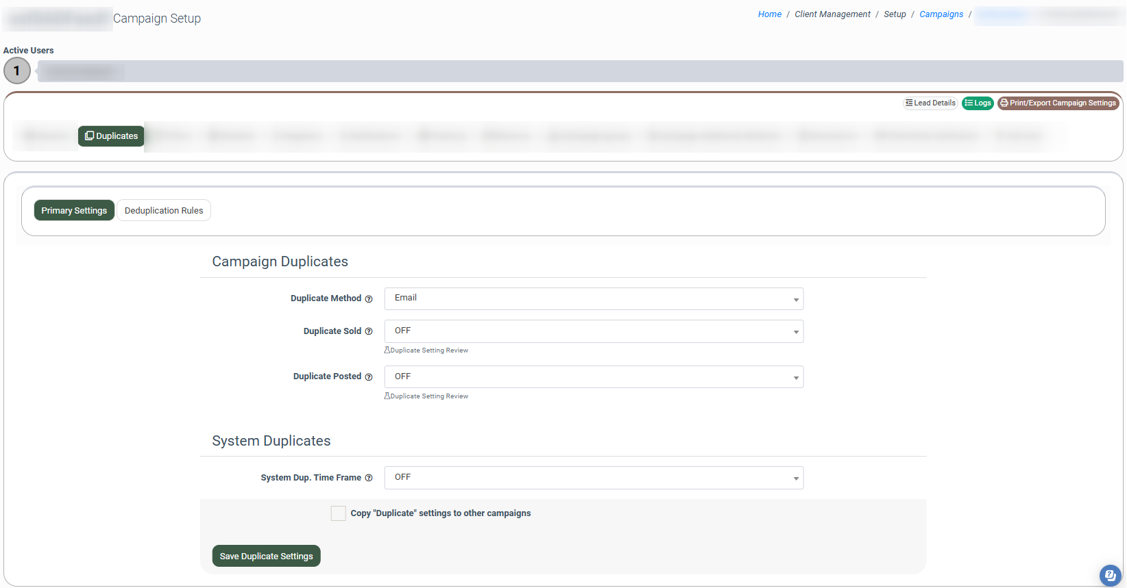 A duplicate lead is a lead that has already been seen in the system. Duplicate leads are identified by set criteria such as email, phone number, etc. To set up the duplication rules, go to the Client Management > Setup > Campaigns section, choose the campaign and click the “Configure” button in the “Actions” column, and select the “Duplicates” tab.