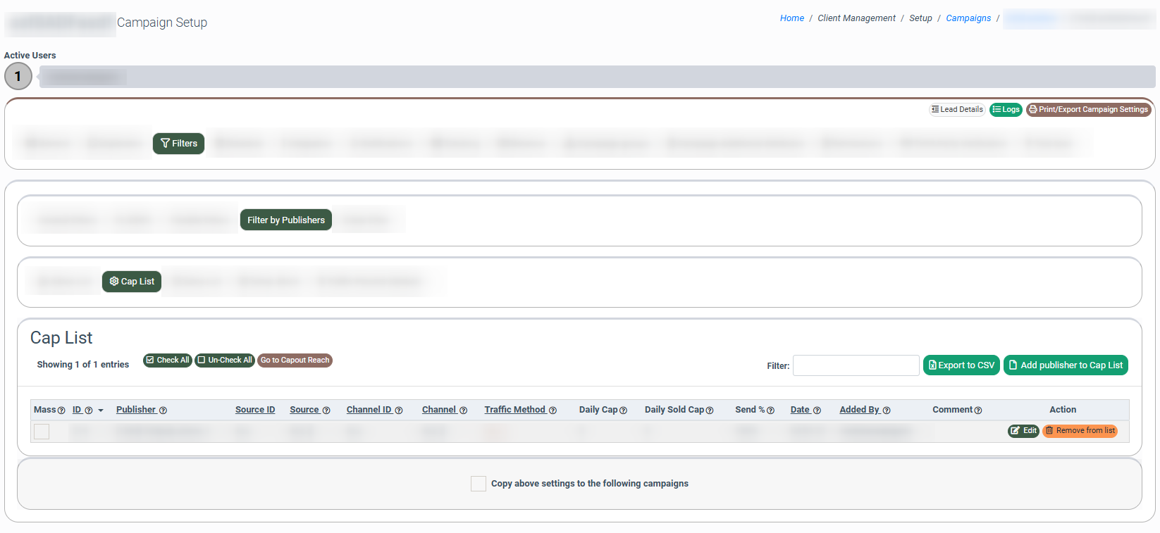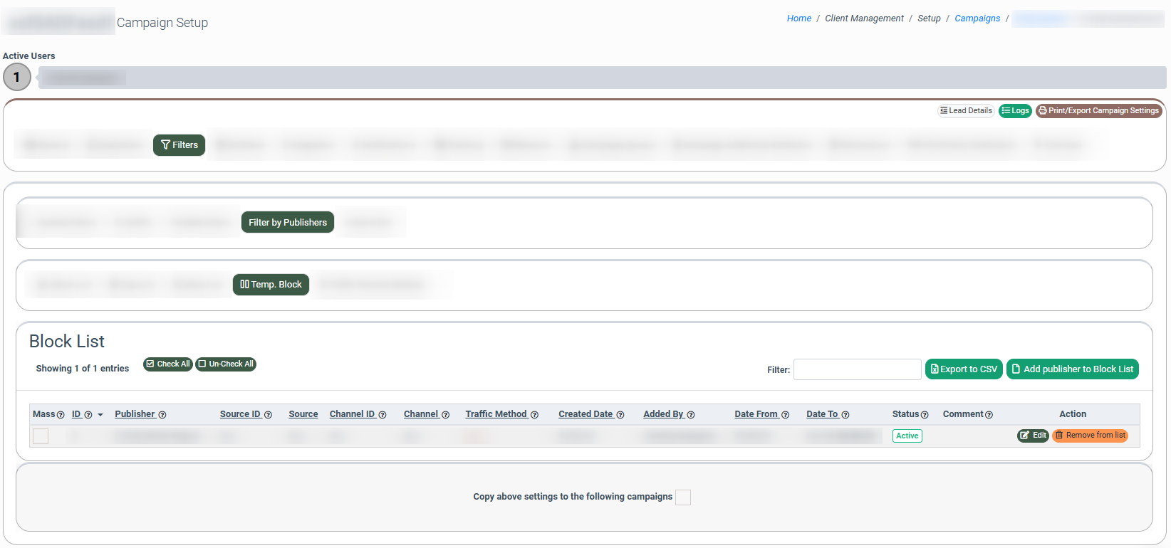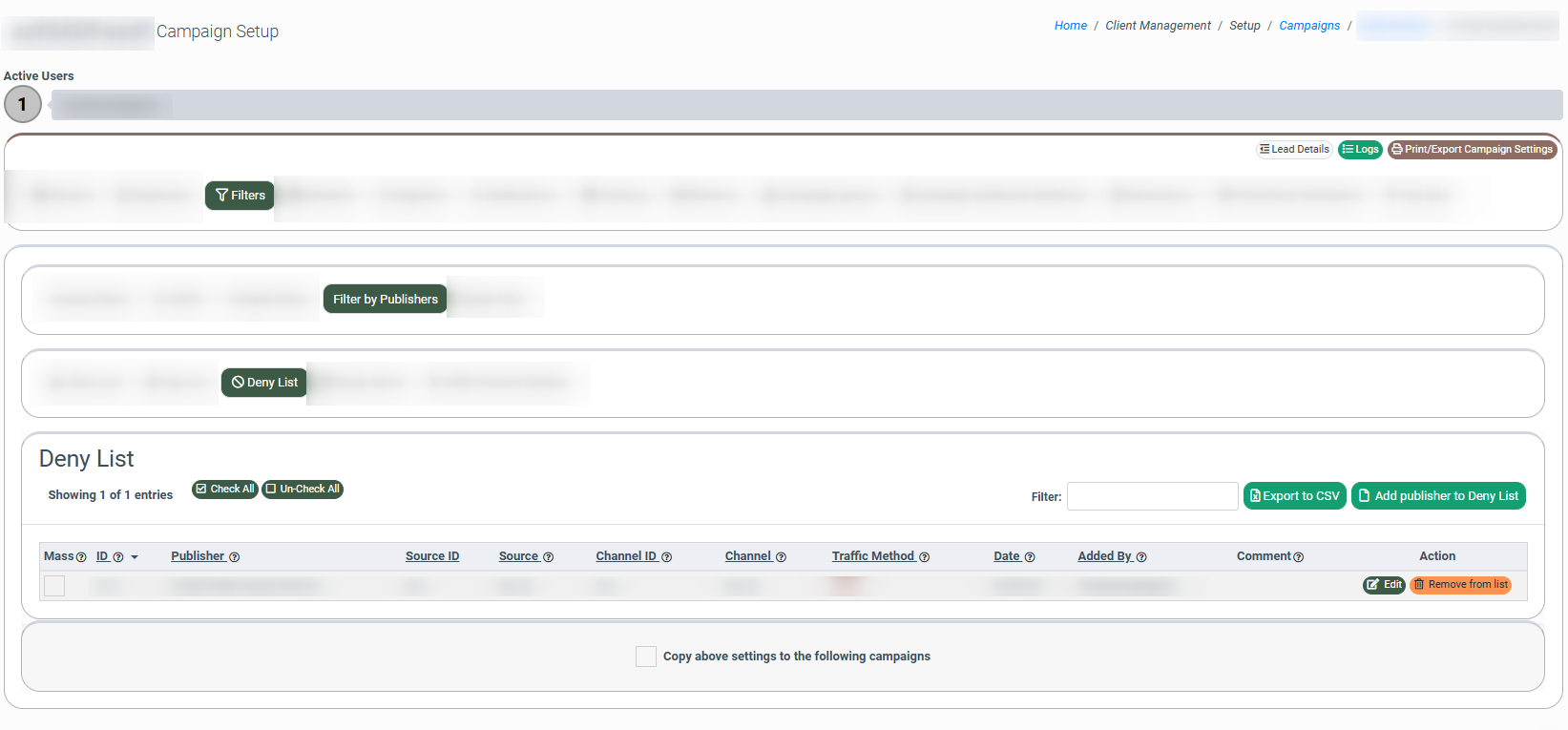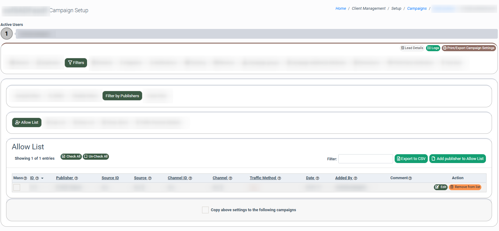 To set the filter by Publisher, go to the Client Management > Setup > Campaigns section, select the “General Campaigns” tab, choose a Campaign, and click the “Configure” button in the “Action” column. Then, on the “Campaign Setup” page, select the “Filters” tab and go to the "Filter by Publishers" subtab.