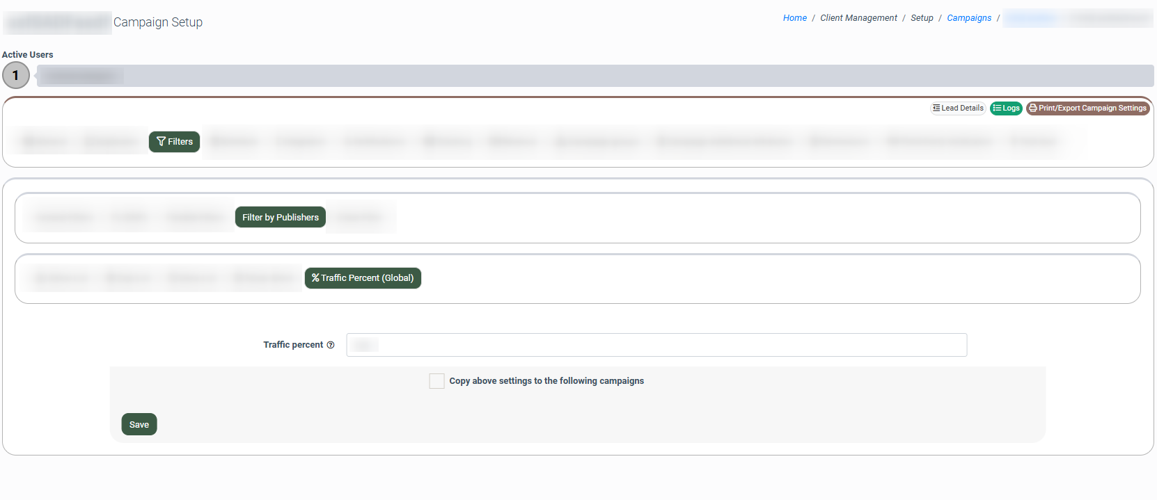 The “Traffic Percent (Global)” sub-tab allows you to set the percentage ratio of lead traffic to be sent to this Campaign when other requirements are met.