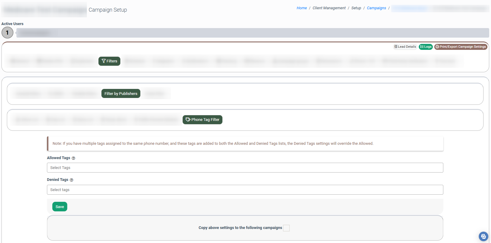 Denied Tags: Select the Phone Number Tag to add the Publisher to the Deny list. When the denied tags are set for the Campaign, this Campaign will only accept traffic from the phone numbers with the listed tags.