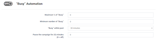 - Pause the campaign for (X) minutes (0=off): Enter the number of minutes to pause the campaign when the maximum set percentage of calls with busy status is reached.