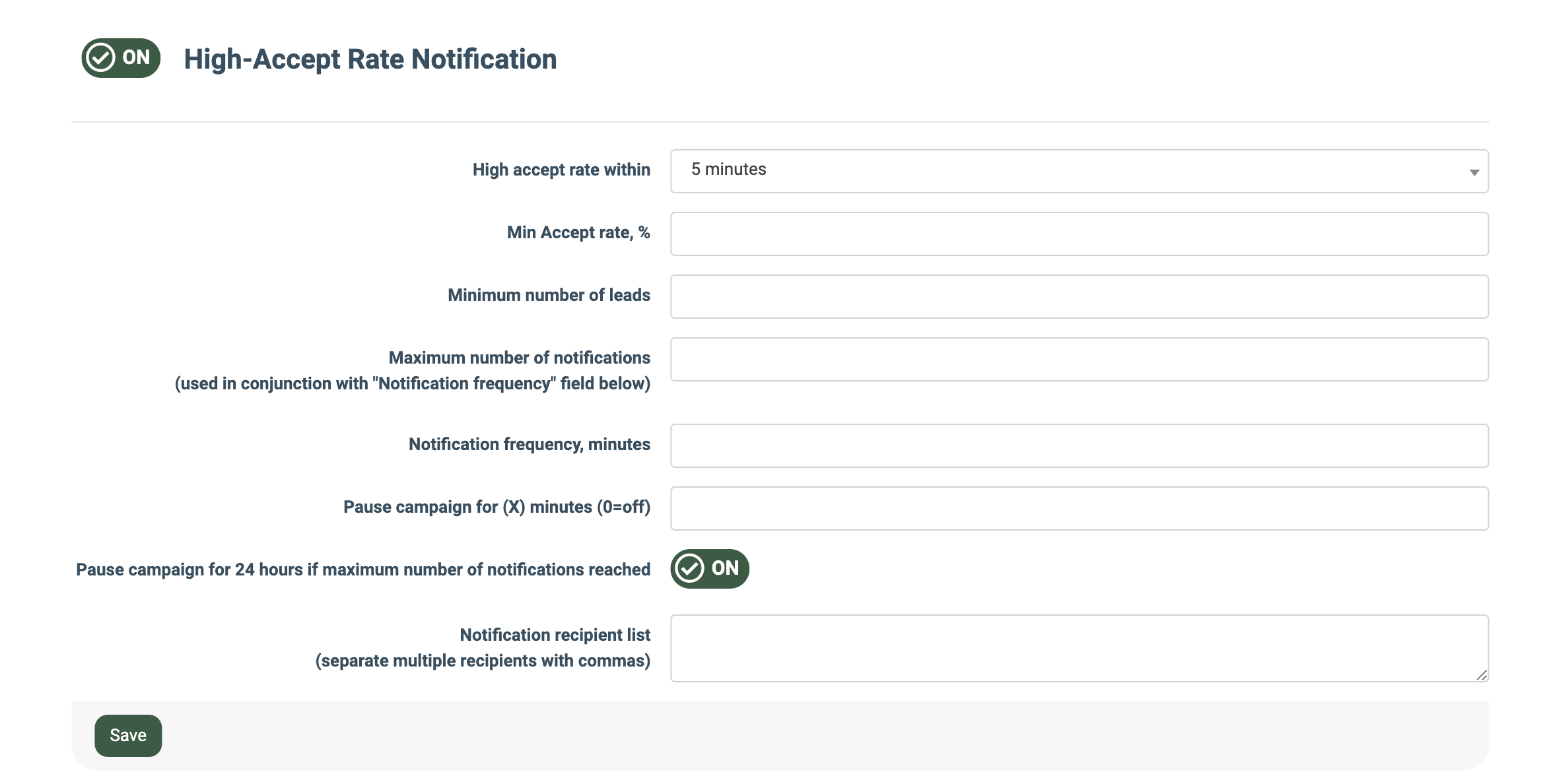 The "High-Accept Rate Notification" feature allows you to enable and configure notifications for Buyers who wish to receive alerts regarding Campaigns that exceed the specified Accept Rate within a designated period to prevent an unwanted increase in sales. To configure the High-Accept Rate notifications, fill in the following fields: