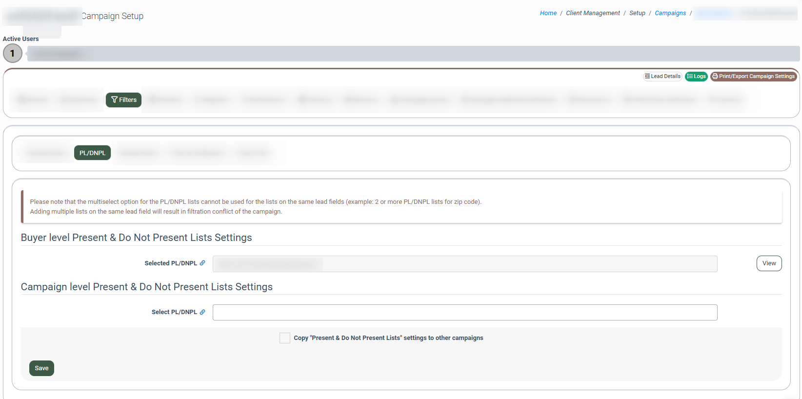 The PL/DNPL tab allows you to configure Present or Do Not Present Lists for a Campaign and use them to filter leads based on the list of set parameters.