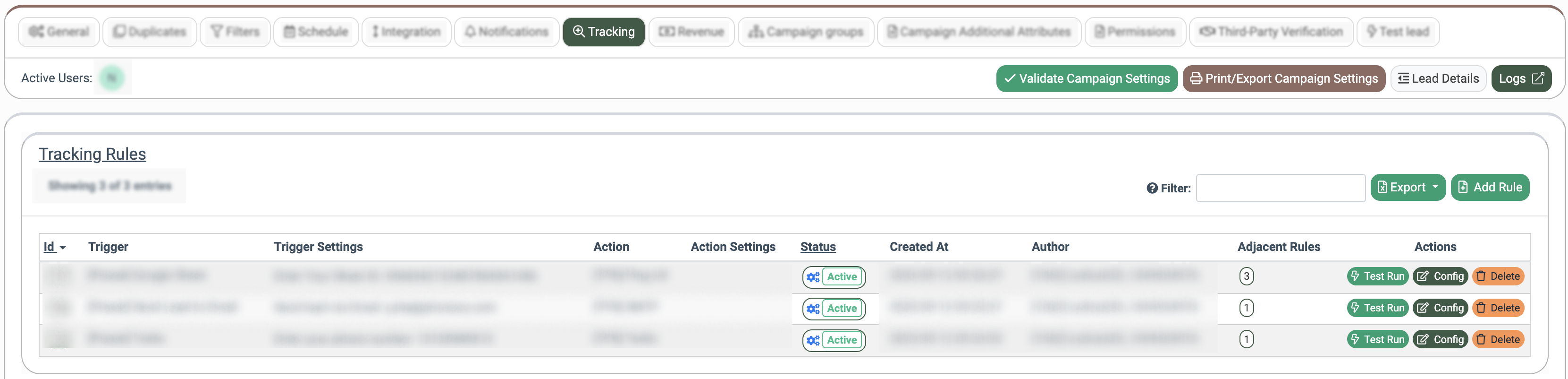 The “Tracking” block allows you to set up the Event Tracking rules. The Event Tracking feature allows you to track the various events in the system(e.g., lead sold, lead rejected, etc.) and set the actions to be automatically triggered by them. Read more about Event Tracking in this article.