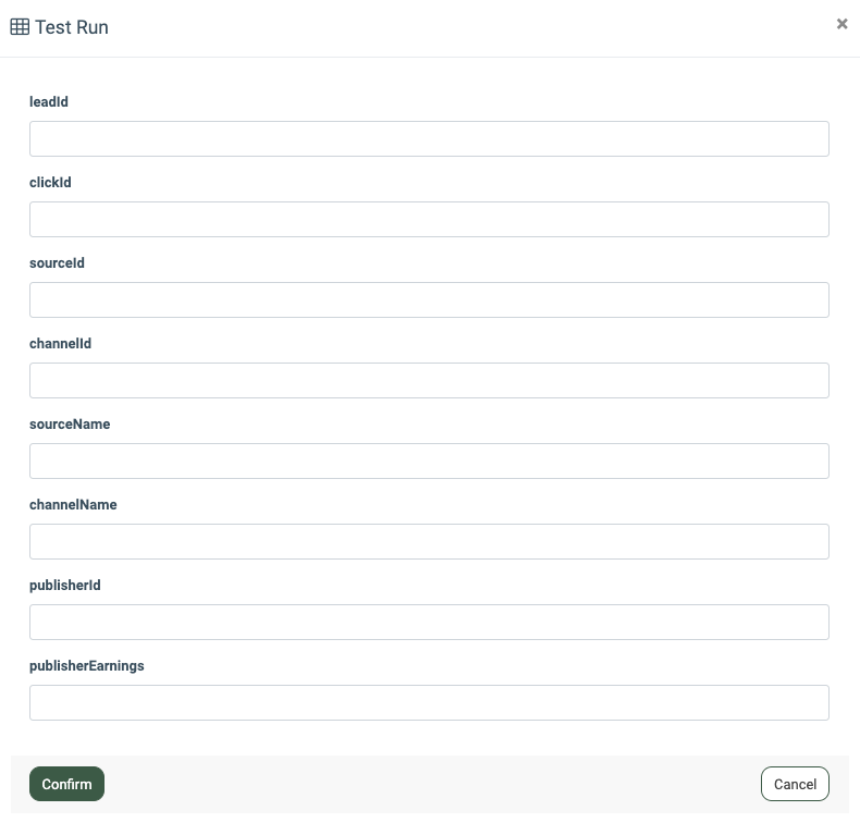 To test the existing tracking rule configuration, click the “Test Run” button in the “Actions” column. Fill in the test data in the provided fields (not mandatory) that match the tracking rule configuration placeholders.