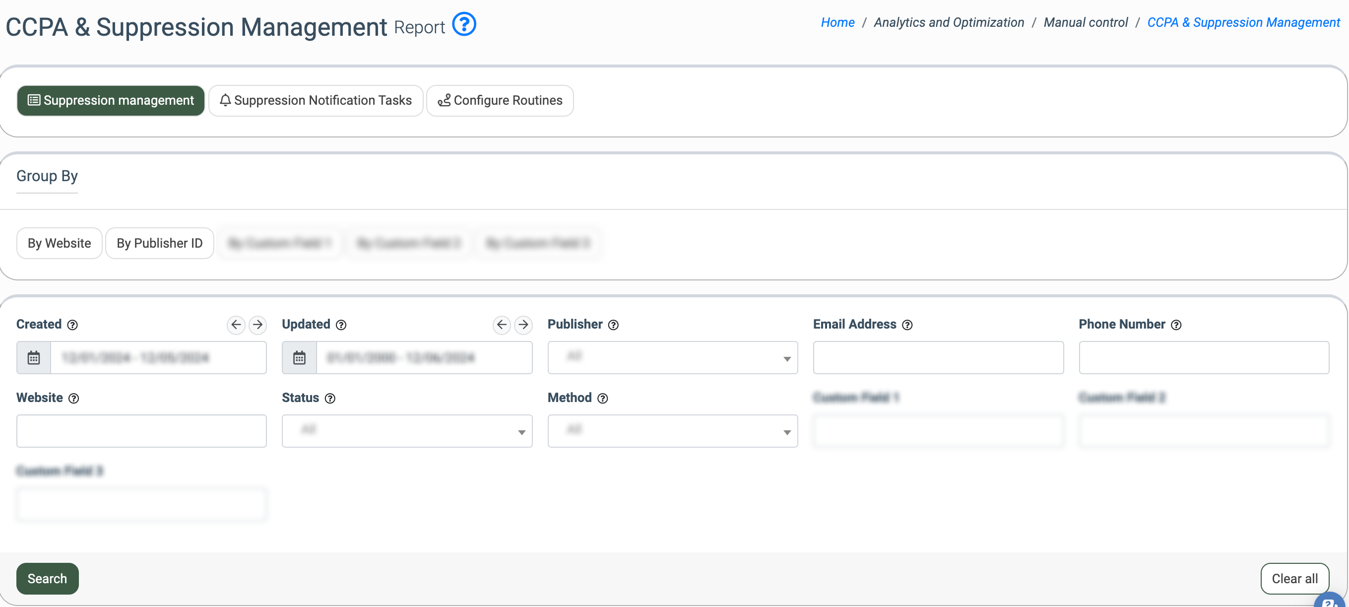 The CCPA & Suppression Management report allows you to monitor and process the unsubscribe and consumer data requests in the system.