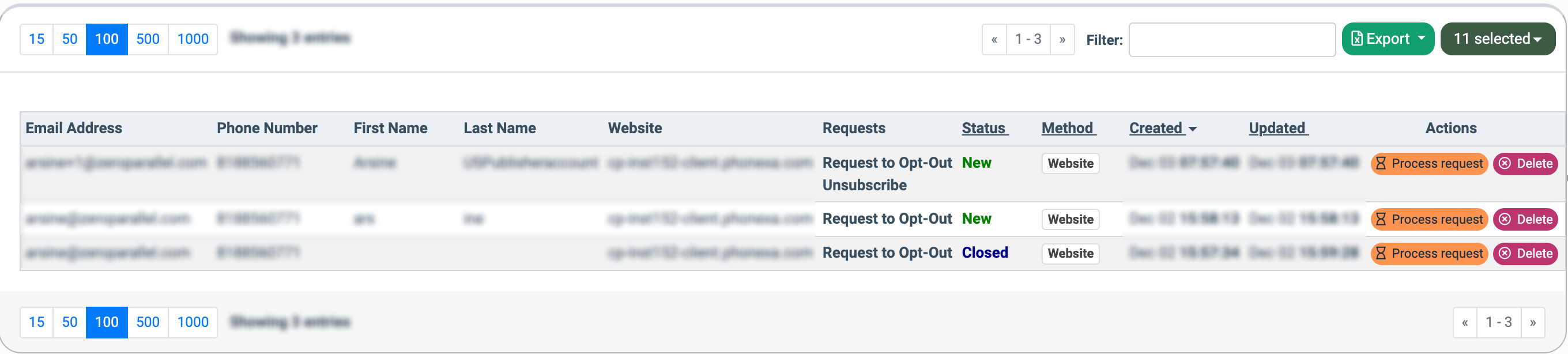 The "Suppression Management" tab displays a list of all unsubscribe and consumer data requests, along with general information about each lead for the selected period. You can group this information by website or Publisher according to your preference. Additionally, you have the option to process or remove these requests.