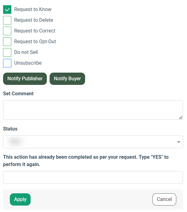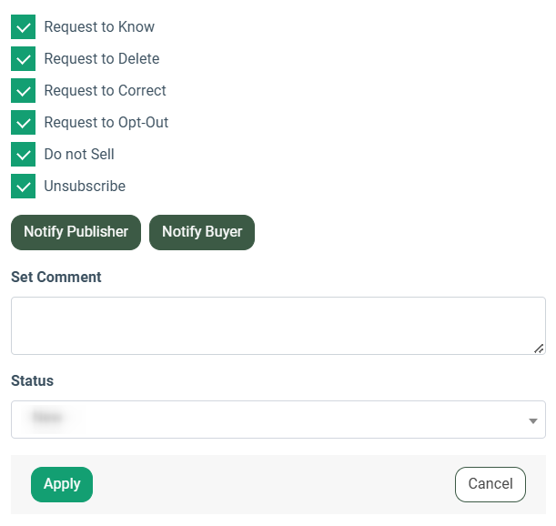 To process a new request through the system, click the “Process Request” button in the “Actions” column. In the pop-up window, specify the request reason, enter the comment, and select a suitable status of the request. To notify Publisher or Buyer that the lead was added to the CCPA & Suppression management list, click the respective buttons - “Notify Publisher” or “Notify Buyer”.