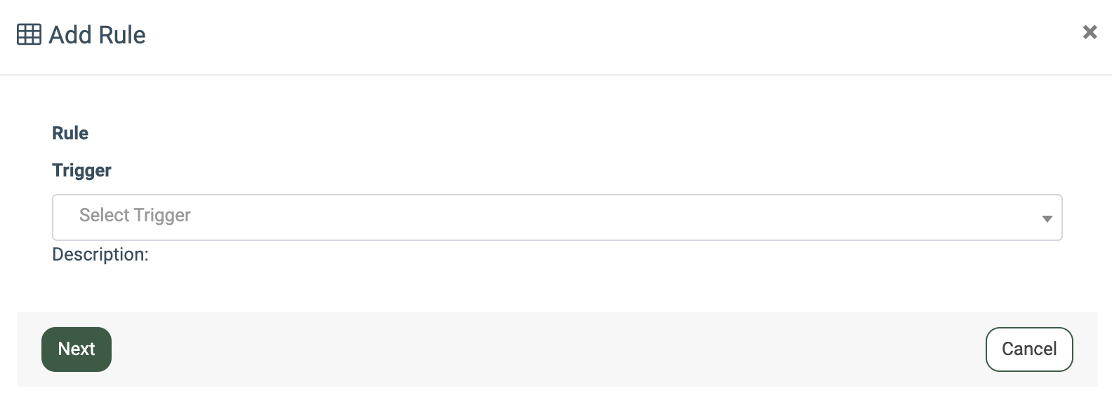To set up a new event tracking rule, click the “Add Rule” button. Select the request reason that will trigger the event tracking action via the “Trigger” field. Click the “Next” button to continue.