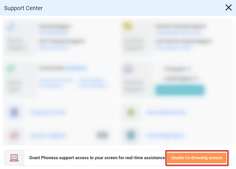 Also, you can stop the ongoing session by clicking the “Disable Co-Browsing session” button in the “Support Center” pop-up window.