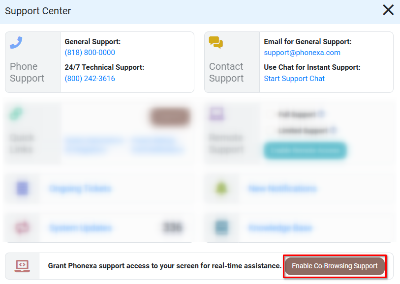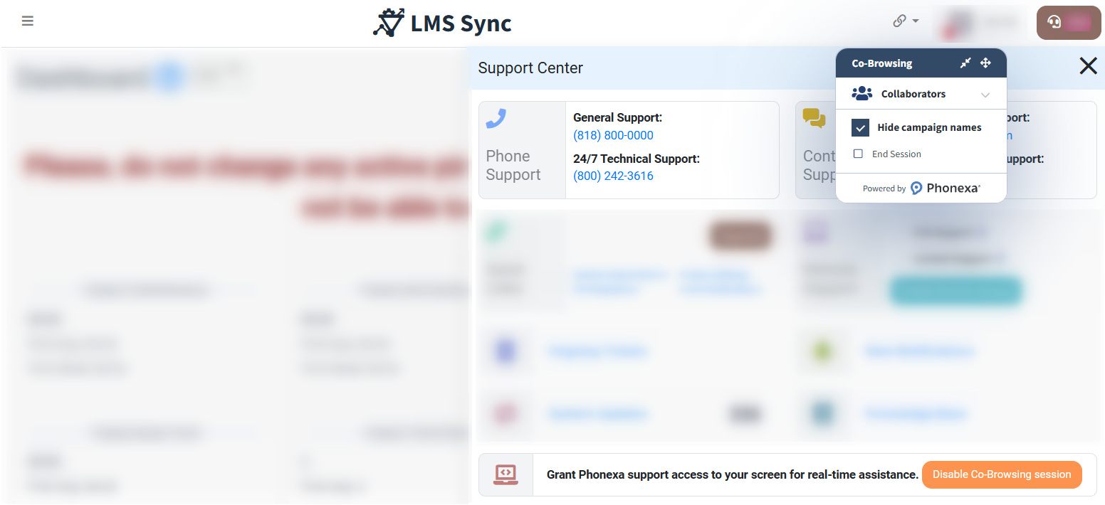 Co-browsing enables real-time, shared browsing sessions where Phonexa support can view your screen within your own instance and guide you through troubleshooting or system navigation.
