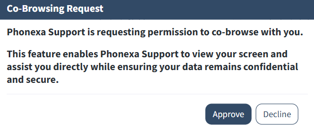 To confirm the joining request from the manager and add him as a participant to the ongoing co-browsing session, click the “Approve” button in the “Co-Browsing Request” pop-up window.