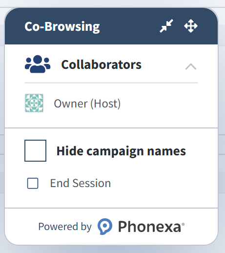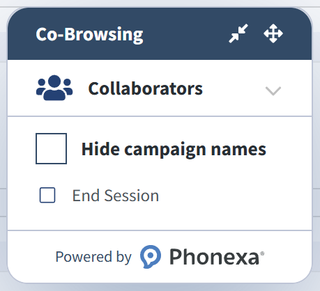 The “Co-Browsing” widget will appear and allow you to manage the common session.