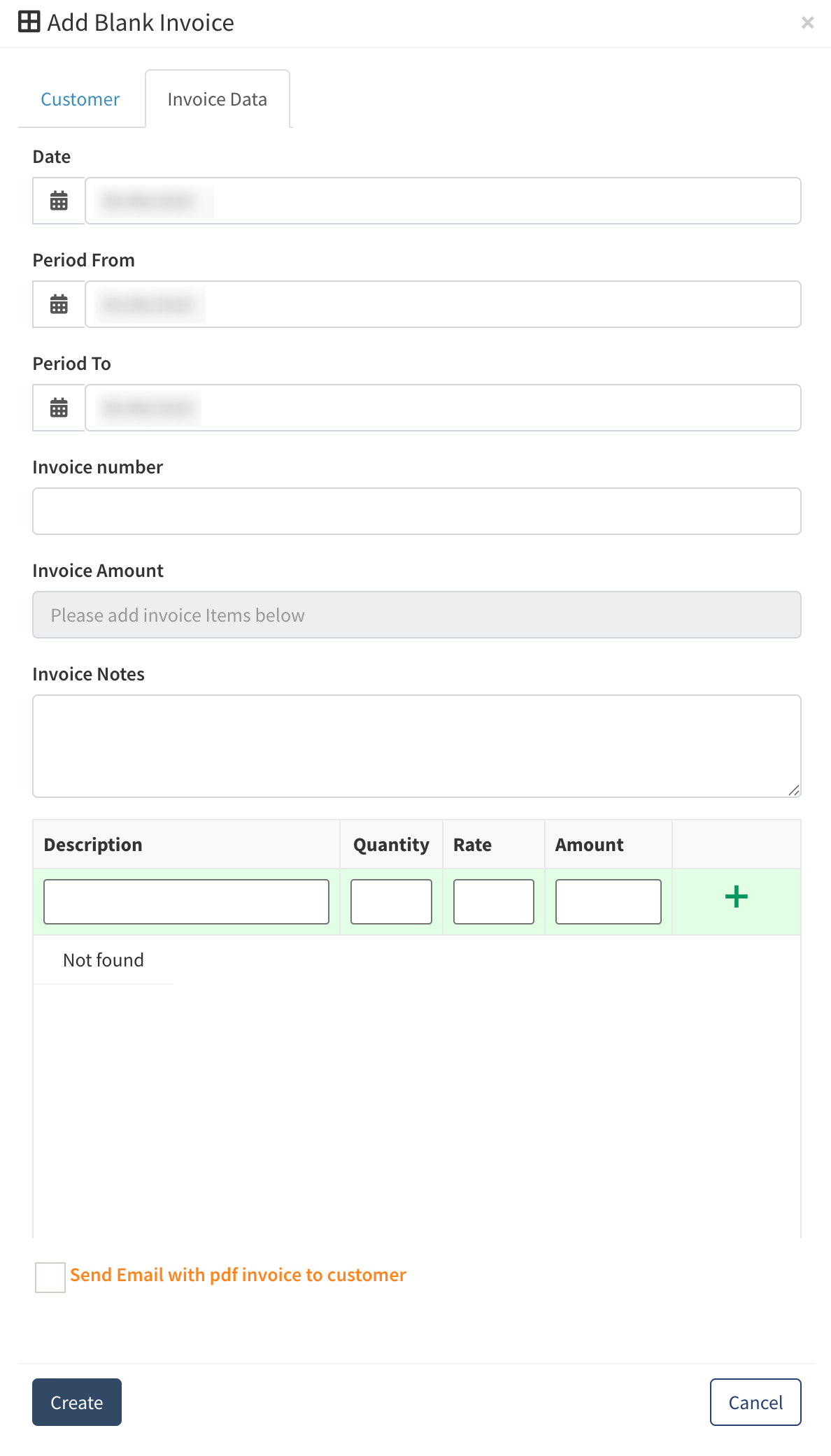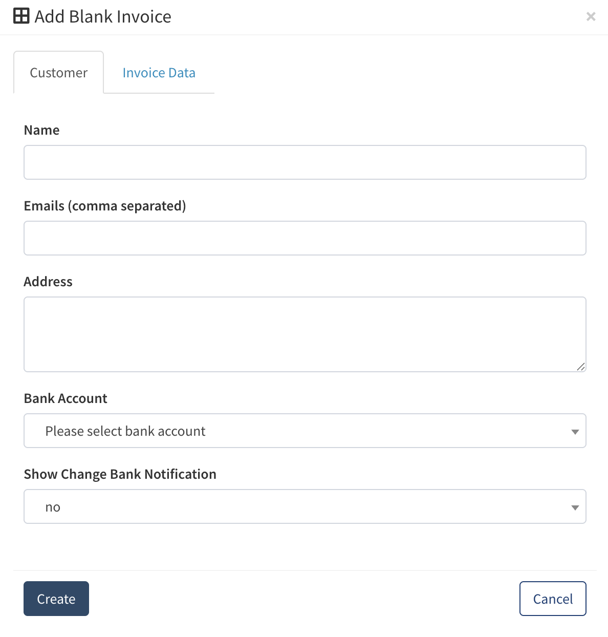 To manually create a new invoice blank for a Customer, click the “Add Blank Invoice” button. In the pop-up window, fill in the following fields of the “Customer” tab: