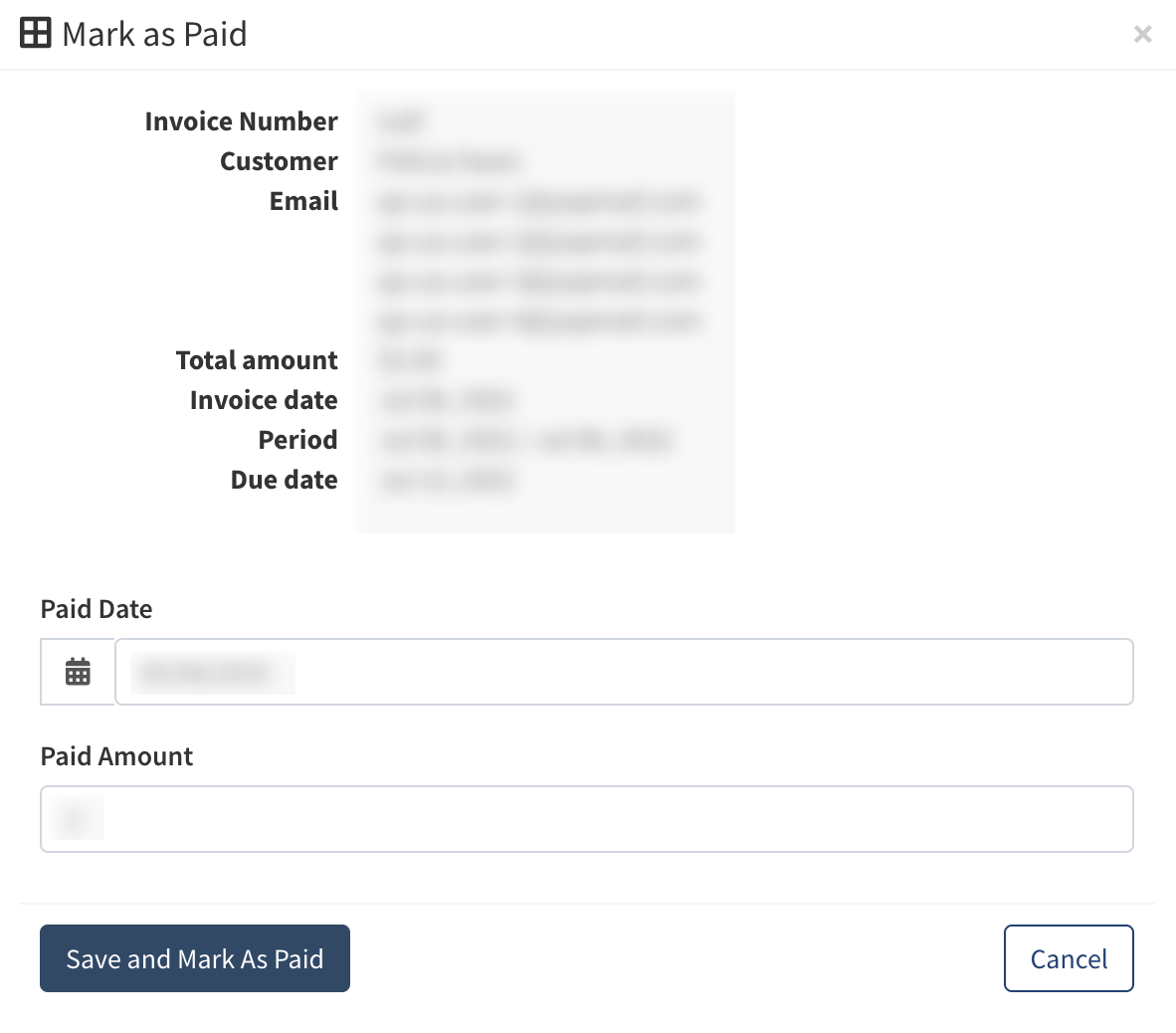 To change the payment status of the invoice to paid, click the “Mark as Paid” button in the “Actions” column. Select the paid date, enter the paid amount, and click the “Save and Mark As Paid” button to complete.