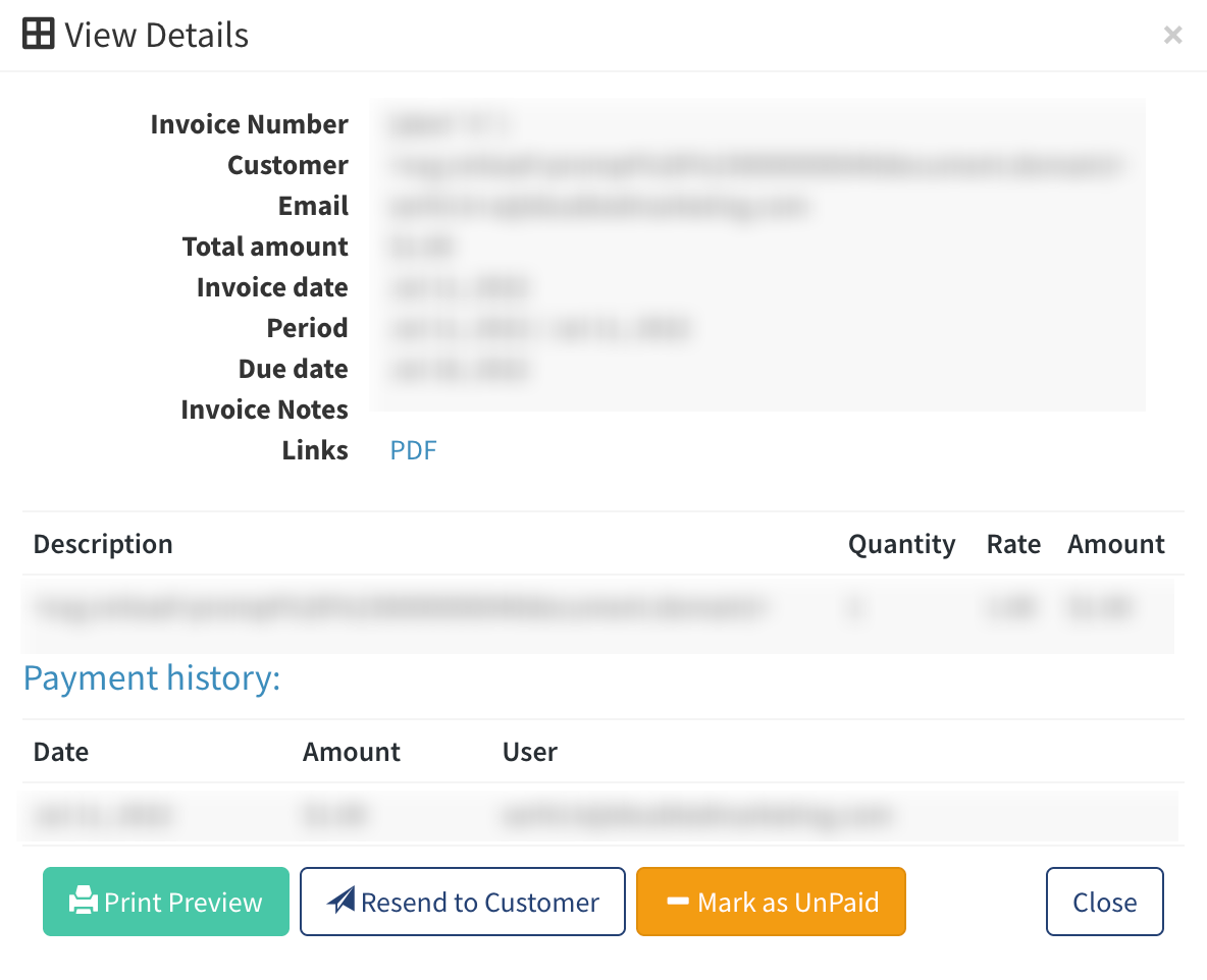 To view, edit, print, and resend the custom invoice record, click the “View Details” button in the “Actions” column.