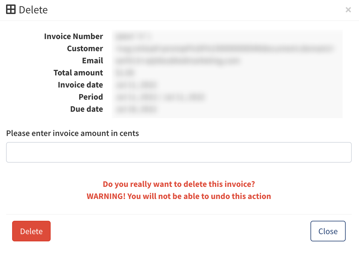 To delete the invoice record from the list, click the “Delete” button in the “Actions” column. Confirm the action by entering the invoice amount and clicking the “Delete” button in the pop-up window.