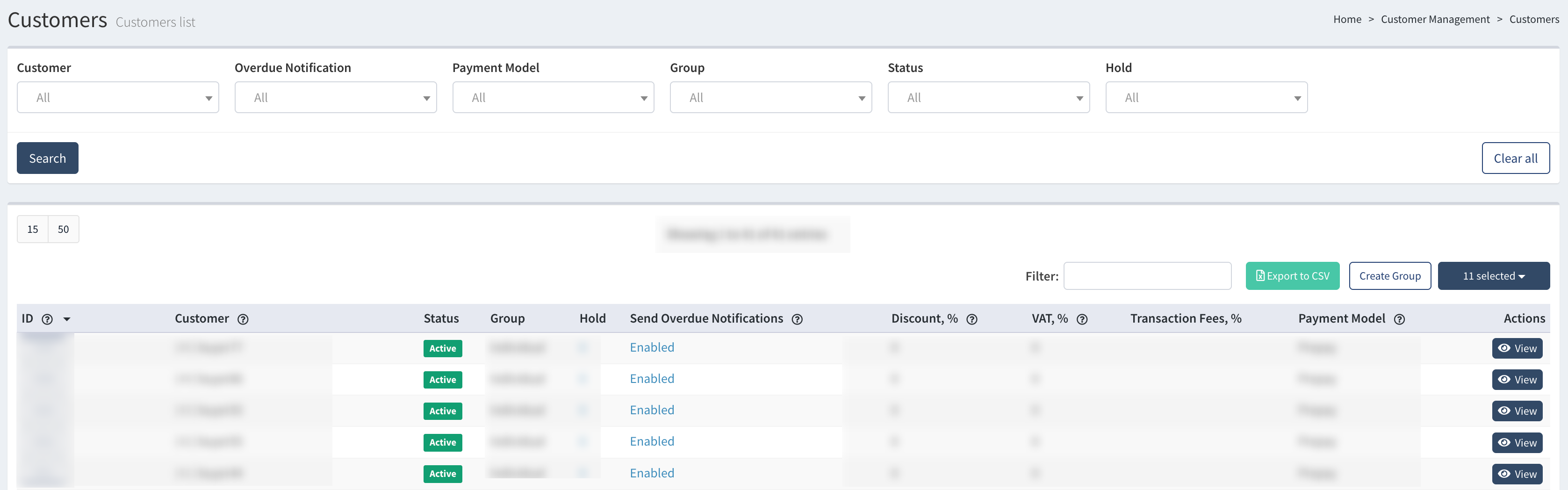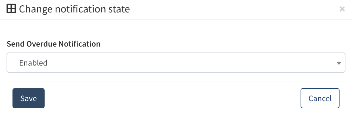- Send Overdue Notifications: The Customer’s chosen notification configuration. To manage the notification settings, click the button in the corresponding column. Select the preferred option in the “Send Overdue Notification” field and click the “Save” button.