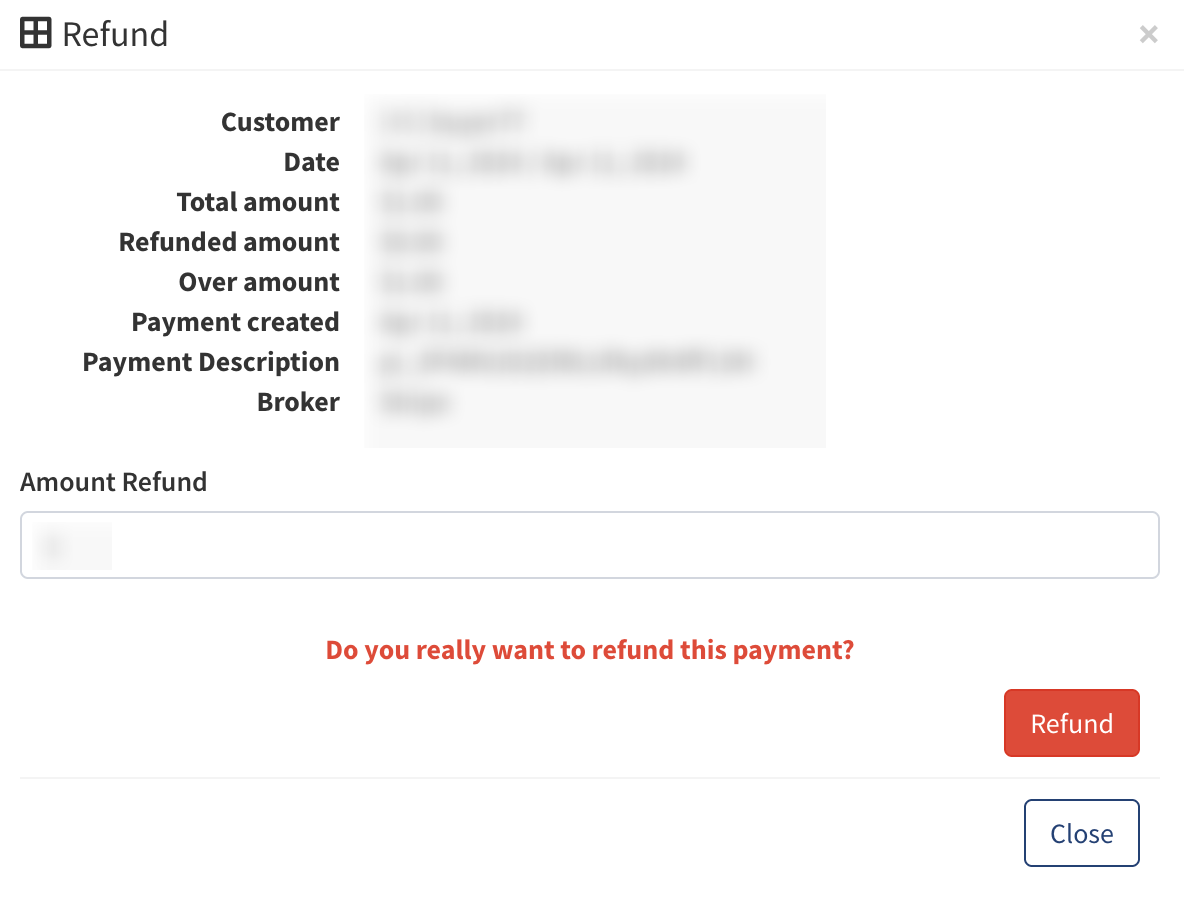 To make a refund for the specific payment, click the “Refund” button in the “Actions” column. In the pop-up window, enter the amount and click the “Refund” button.