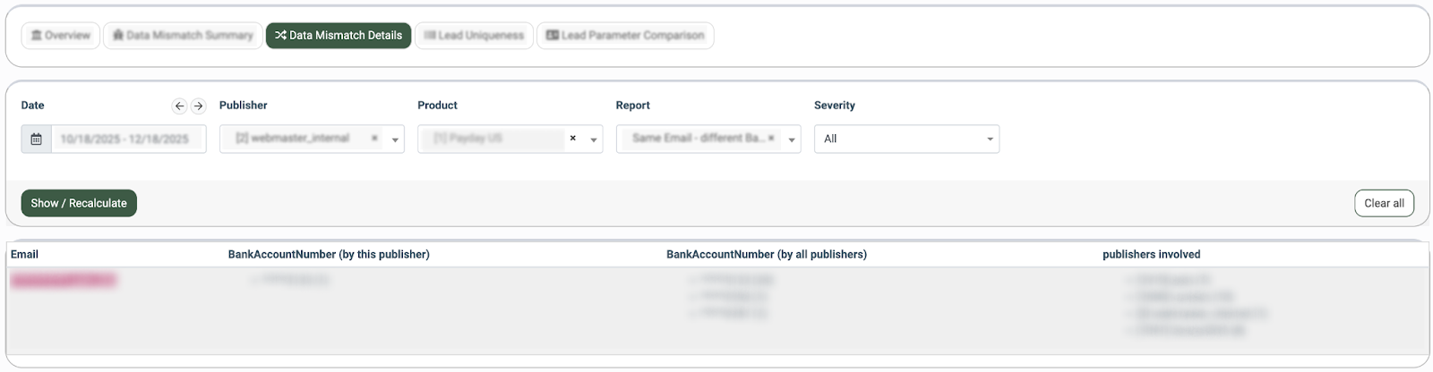 Click the “Details” button to check the mismatch data for the specific leads. The system will redirect you to the “Data Mismatch Details” tab.