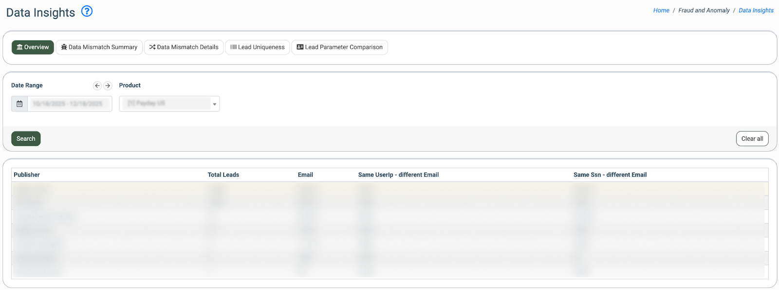The Overview tab allows admin users to monitor specific Publishers for fraudulent activity. The report provides a summary overview of Publishers based on lead uniqueness, according to the specific parameters set by the Product.